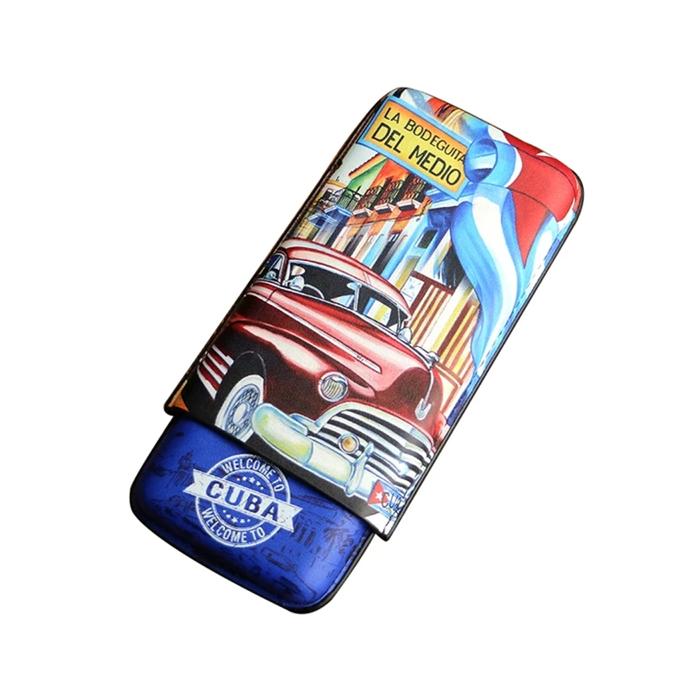 Ett smidigt cigarretui för tre cigarrer prytt med ett motiv som är urtypiskt för Kuba – en klassisk, rödlackad veteranbil, troligen en Chevrolet från 1950-talet. Dessa ikoniska bilar, mycket vanliga i Havanna, är en symbol för Kubas charm och används ofta som taxis eller i turismsammanhang.