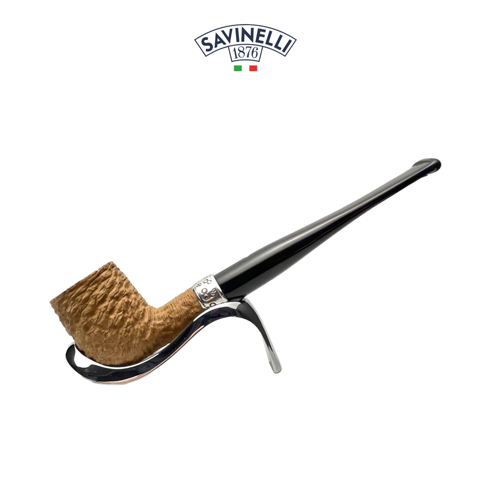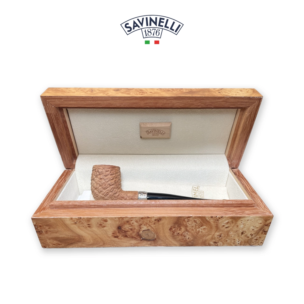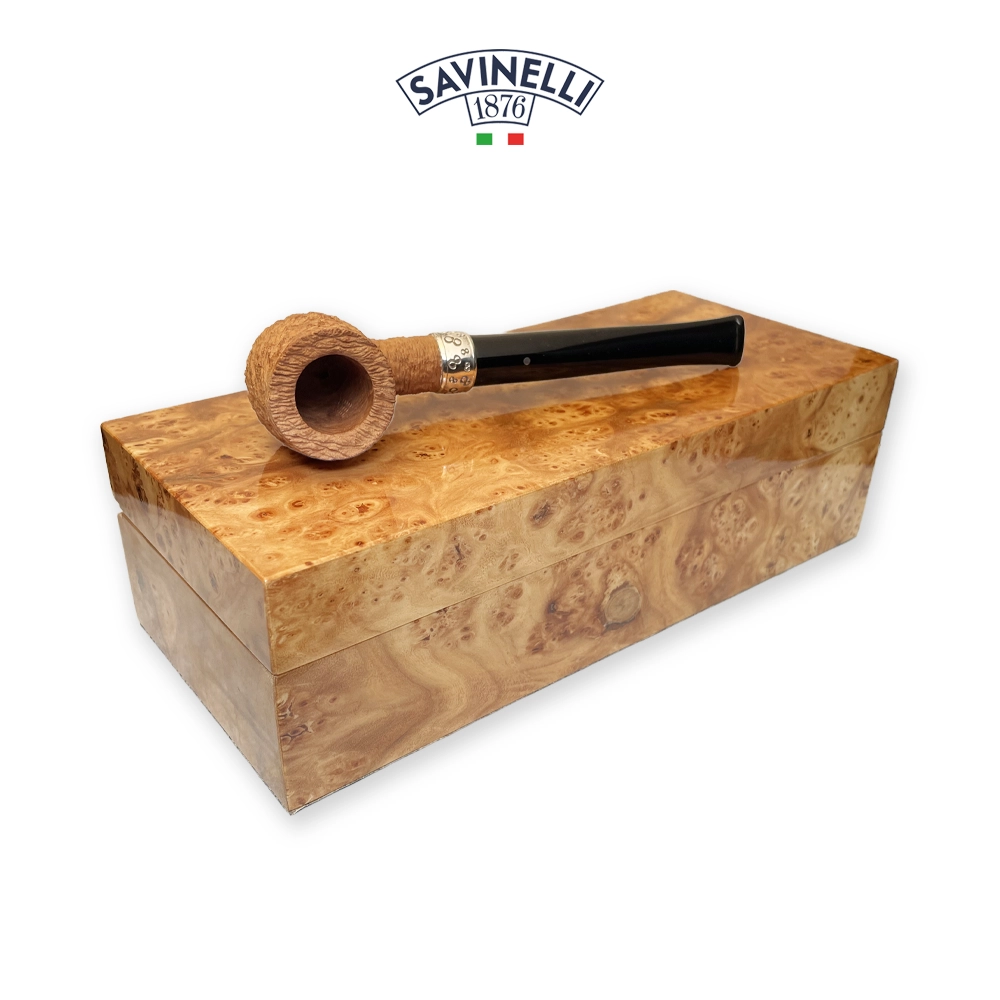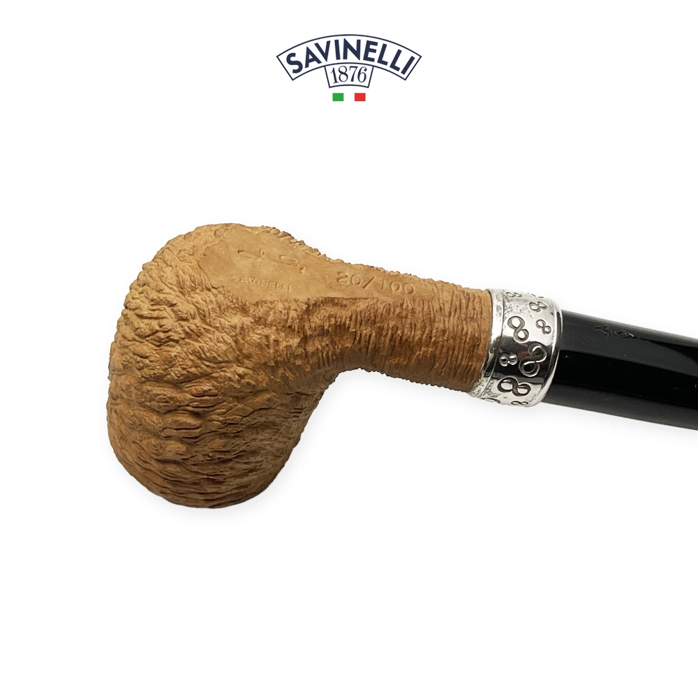 Savinelli 100th Anniversary Achille Punto Oro. För att uppmärksamma att Achille Savinelli föddes för 100 år sedan, 8/8 1918, har Savinelli producerat en pipa i hans favoritmodell i en begränsad upplaga om 100 stycken. För denna speciella pipa har Savinelli valt sin form 106 och en korallfinish, en mycket sällsynt men alltid eftertraktad finish. En 4-grams 925 silverring, med nummer 8 skuret på olika positioner, fulländar utseendet. Allt görs ännu mer speciellt med en av de finaste anpassade träaskar vi någonsin har sett.