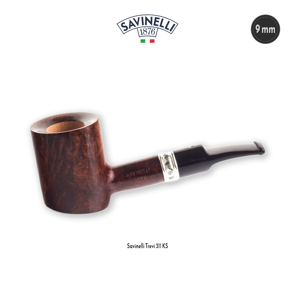 Savinelli Trevi Smooth 311 KS är en halvböjd Poker som har en slät, mörkbrun finish med en resolut men ändå dynamisk tolkning av den klassiska, utilitaristiska formen, kännetecknad av huvudets uttalade framåtlutning och den korta halsen som har en lätt nedåtvänd böj. Den robusta ståkapaciteten gör den till den perfekta skrivbordspipan, medan den skarpt avfasade kanten återspeglar den fasta estetik som kännetecknar den definierade övergången och det cylindriska huvudet.