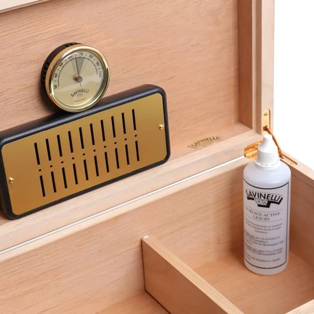 Savinelli Verona Large – Cigarhumidor täckt med mahognyträ. Cederträ på insidan, perfekt för att bevara cigarrernas doft. Detta skrin är utrustat med avdelare, hygrometer och fuktare som kan fuktas med Savinelli-vätska som ingår i förpackningen.