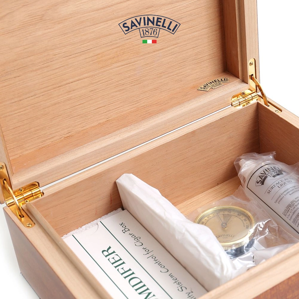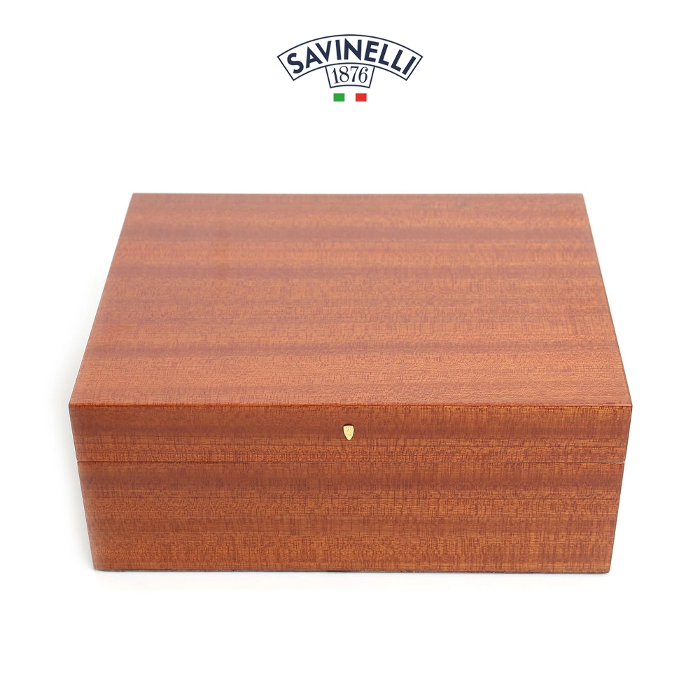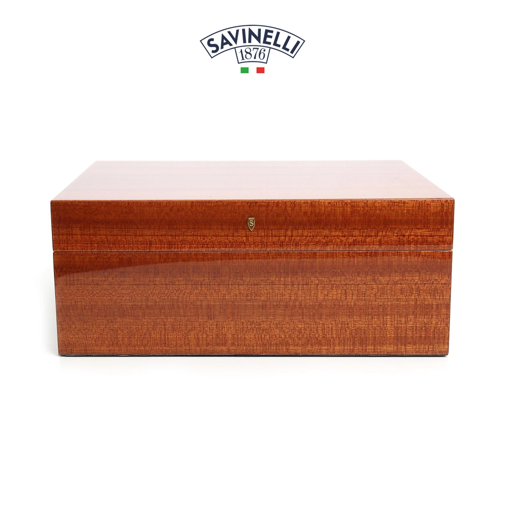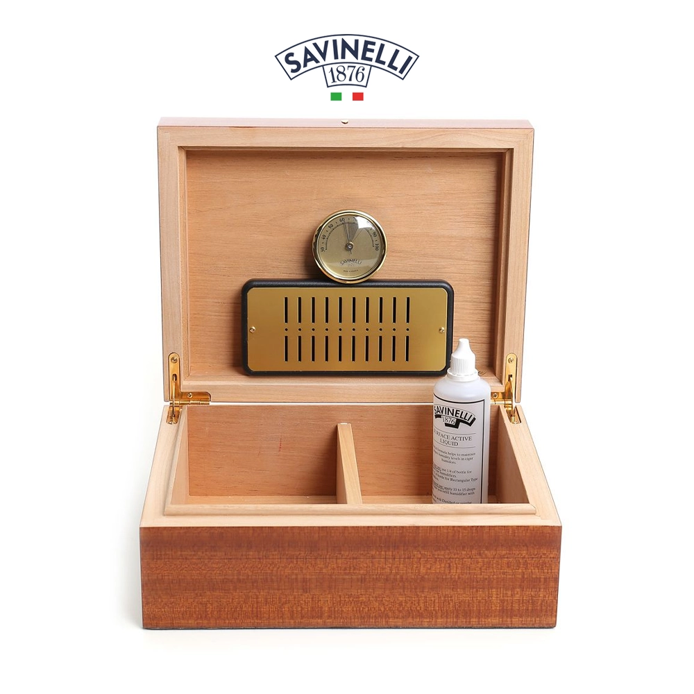 Savinelli Verona Medium – Cigarrhumidor täckt med mahognyträ. Cederträ på insidan, perfekt för att bevara cigarrernas doft. Detta skrin är utrustat med avdelare, hygrometer och fuktare som kan fuktas med Savinelli-vätska som ingår i förpackningen.